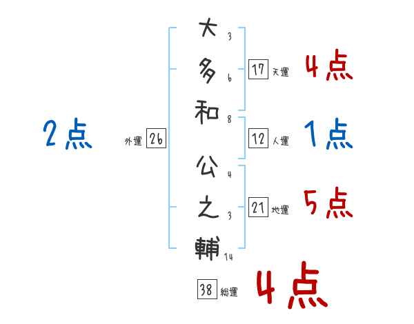 外運![]() | 大多和公之輔さんの外運は26画の2つ星!波瀾万丈かも。信頼できる人を大事にしましょう。 生活面を象徴する運勢です。外部から受ける影響力を表し、結婚運、家庭運や職場、環境への順応性を表します。 |