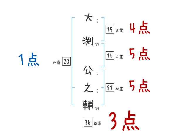 人運![]() | 大渕公之輔さんの人運は16画の5つ星!人望が厚く大きく発展する。逆転成功が見える。 性格や才能などを表す2番目に重要な運勢です。人間関係や協調性、社会的な成功に影響します。主に20歳から50歳ぐらいまでの中年期の運勢を表します。 |