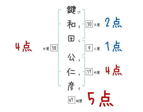 総運![]() | 鍵和田公仁彦さんの総運は47画の5つ星!実力が開花し発展する円満な人生。財に恵まれる。 あなたの人生を表す1番重要な運勢です。生涯を通じて影響する総合運となり、主に50歳以降の晩年期に影響を及ぼします。 |