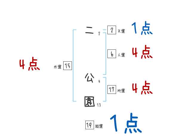 天運![]() | 二公園さんの天運は2画の1つ星!優しいですが積極性や意思の強さに欠ける傾向があります。家庭環境の乱れに注意しましょう。 家系が持つ宿命的な運勢を表します。祖先から受け継いだ苗字ですので自分の力が及びません。家柄を象徴します。 |