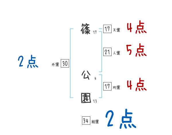 総運![]() | 篠公園さんの総運は34画の2つ星!独創性に優れるが、自尊心が強く災難に注意しましょう。 あなたの人生を表す1番重要な運勢です。生涯を通じて影響する総合運となり、主に50歳以降の晩年期に影響を及ぼします。 |