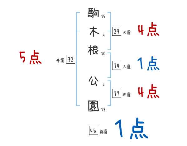 外運![]() | 駒木根公園さんの外運は32画の5つ星!柔軟性があり成功する。チャンスが多く金運が良い。 生活面を象徴する運勢です。外部から受ける影響力を表し、結婚運、家庭運や職場、環境への順応性を表します。 |