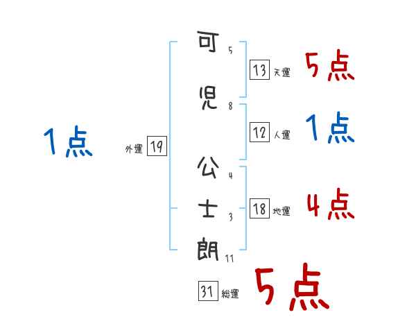 総運![]() | 可児公士朗さんの総運は31画の5つ星!社交性があり判断力に優れる。順風満帆な人生で円満な生活。 あなたの人生を表す1番重要な運勢です。生涯を通じて影響する総合運となり、主に50歳以降の晩年期に影響を及ぼします。 |