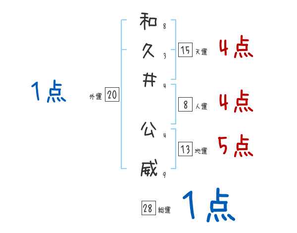 総運![]() | 和久井公威さんの総運は28画の1つ星!家庭環境に注意。スポーツで活躍できる能力があるかも。 あなたの人生を表す1番重要な運勢です。生涯を通じて影響する総合運となり、主に50歳以降の晩年期に影響を及ぼします。 |