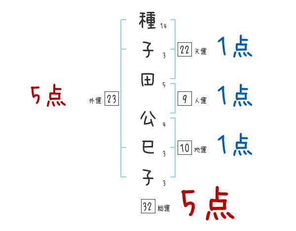 総運![]() | 種子田公巳子さんの総運は32画の5つ星!柔軟性があり成功する。チャンスが多く金運が良い。 あなたの人生を表す1番重要な運勢です。生涯を通じて影響する総合運となり、主に50歳以降の晩年期に影響を及ぼします。 |