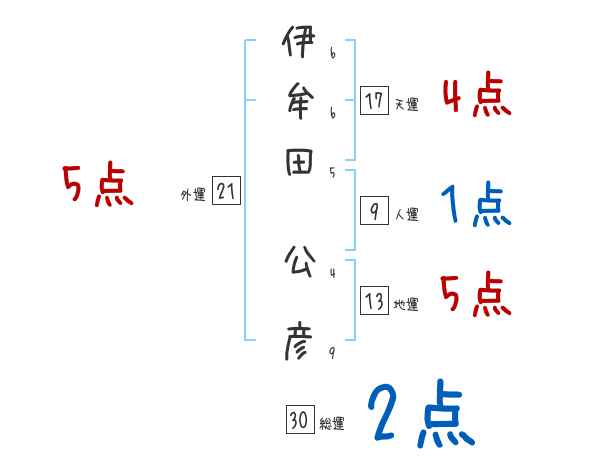 外運![]() | 伊牟田公彦さんの外運は21画の5つ星!統率力がある。独立し成功する。名誉を手に入れる。 生活面を象徴する運勢です。外部から受ける影響力を表し、結婚運、家庭運や職場、環境への順応性を表します。 |