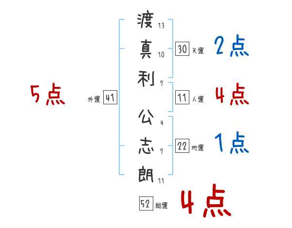 総運![]() | 渡真利公志朗さんの総運は52画の4つ星!先見性と独創性に優れ考える力がある。強運の持ち主。 あなたの人生を表す1番重要な運勢です。生涯を通じて影響する総合運となり、主に50歳以降の晩年期に影響を及ぼします。 |