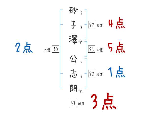総運![]() | 砂子澤公志朗さんの総運は51画の3つ星!変化が激しく、危険に注意。堅実な性格。 あなたの人生を表す1番重要な運勢です。生涯を通じて影響する総合運となり、主に50歳以降の晩年期に影響を及ぼします。 |