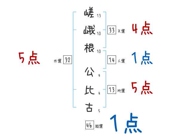 外運![]() | 嵯峨根公比古さんの外運は32画の5つ星!柔軟性があり成功する。チャンスが多く金運が良い。 生活面を象徴する運勢です。外部から受ける影響力を表し、結婚運、家庭運や職場、環境への順応性を表します。 |