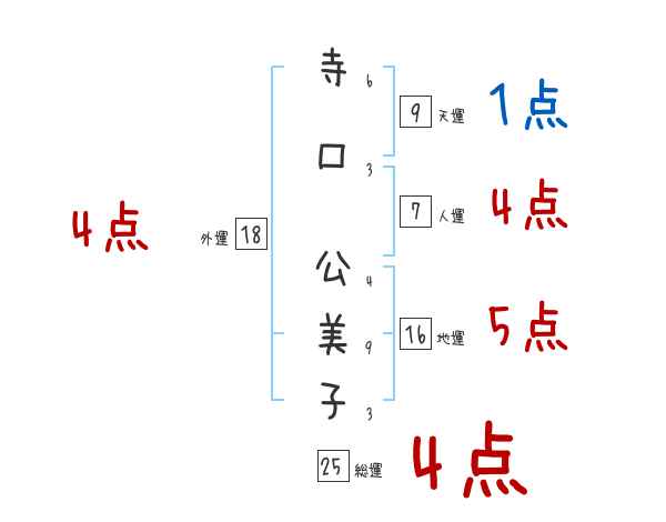 天運![]() | 寺口公美子さんの天運は9画の1つ星!消極的で才能を発揮することが苦手なことも。周りの意見に耳を傾けましょう。 家系が持つ宿命的な運勢を表します。祖先から受け継いだ苗字ですので自分の力が及びません。家柄を象徴します。 |