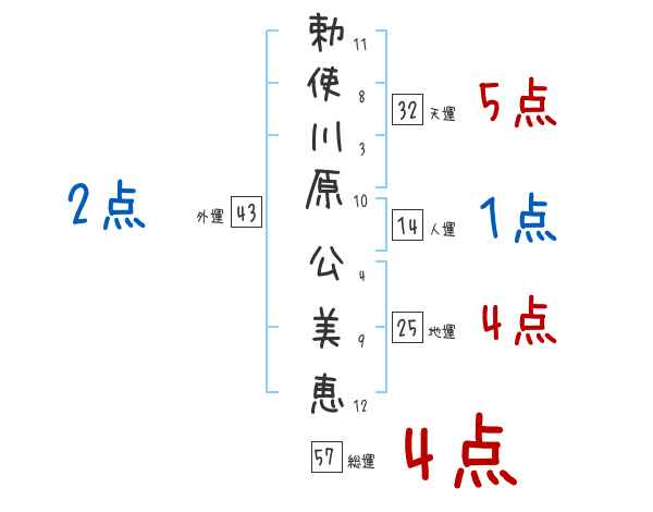 天運![]() | 勅使川原公美恵さんの天運は32画の5つ星!柔軟性があり成功する。チャンスが多く金運が良い。 家系が持つ宿命的な運勢を表します。祖先から受け継いだ苗字ですので自分の力が及びません。家柄を象徴します。 |