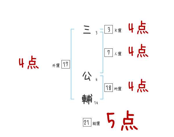 天運![]() | 三公輔さんの天運は3画の4つ星!活動的で才能に恵まれ、多くの信頼を得る。希望に満ち成長する。 家系が持つ宿命的な運勢を表します。祖先から受け継いだ苗字ですので自分の力が及びません。家柄を象徴します。 |
