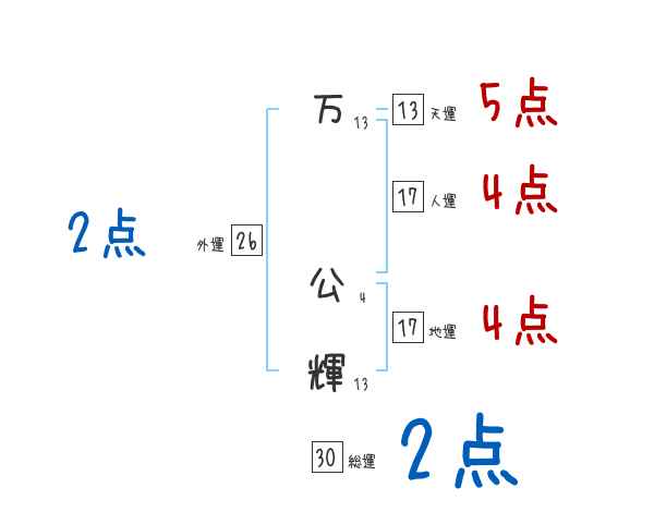 天運![]() | 万公輝さんの天運は13画の5つ星!才能に恵まれ人気がある。名声を手に入れる。円満な人生。 家系が持つ宿命的な運勢を表します。祖先から受け継いだ苗字ですので自分の力が及びません。家柄を象徴します。 |