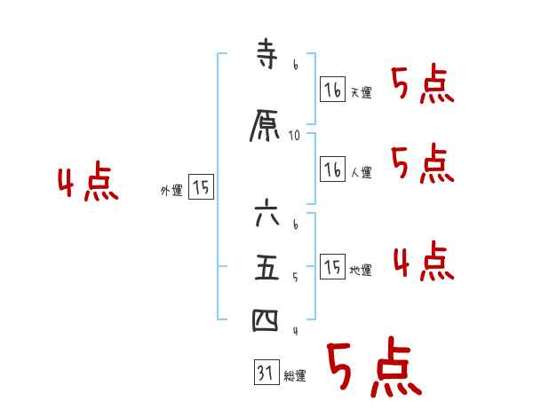 天運![]() | 寺原六五四さんの天運は16画の5つ星!人望が厚く大きく発展する。逆転成功が見える。 家系が持つ宿命的な運勢を表します。祖先から受け継いだ苗字ですので自分の力が及びません。家柄を象徴します。 |