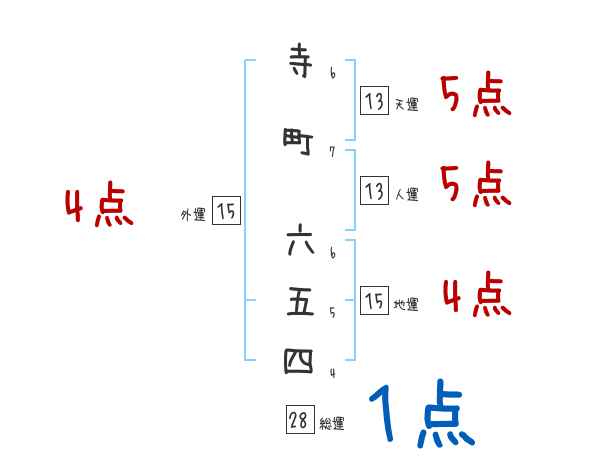 人運![]() | 寺町六五四さんの人運は13画の5つ星!才能に恵まれ人気がある。名声を手に入れる。円満な人生。 性格や才能などを表す2番目に重要な運勢です。人間関係や協調性、社会的な成功に影響します。主に20歳から50歳ぐらいまでの中年期の運勢を表します。 |