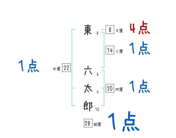 総運![]() | 東六太郎さんの総運は28画の1つ星!家庭環境に注意。スポーツで活躍できる能力があるかも。 あなたの人生を表す1番重要な運勢です。生涯を通じて影響する総合運となり、主に50歳以降の晩年期に影響を及ぼします。 |