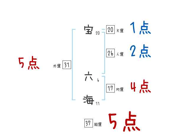 外運![]() | 宝六海さんの外運は31画の5つ星!社交性があり判断力に優れる。順風満帆な人生で円満な生活。 生活面を象徴する運勢です。外部から受ける影響力を表し、結婚運、家庭運や職場、環境への順応性を表します。 |