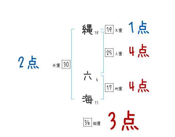 天運![]() | 縄六海さんの天運は19画の1つ星!優れた才能を持ちますが、協調性が足りないことも。周りの人と協力する事を意識しましょう。 家系が持つ宿命的な運勢を表します。祖先から受け継いだ苗字ですので自分の力が及びません。家柄を象徴します。 |