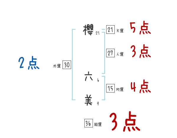 天運![]() | 櫻六美さんの天運は21画の5つ星!統率力がある。独立し成功する。名誉を手に入れる。 家系が持つ宿命的な運勢を表します。祖先から受け継いだ苗字ですので自分の力が及びません。家柄を象徴します。 |