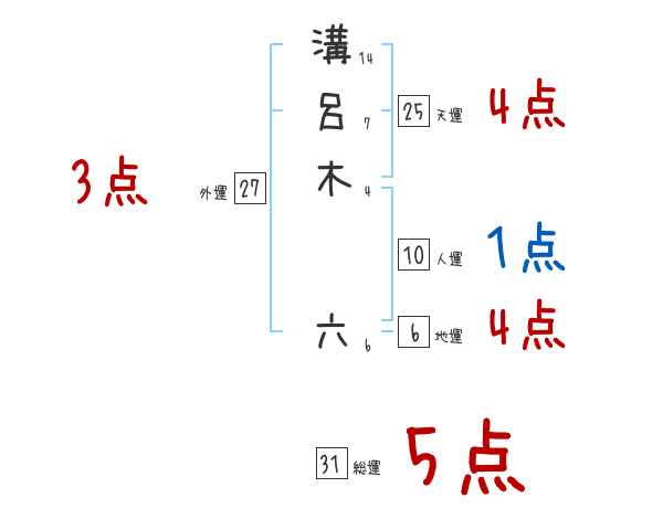 総運![]() | 溝呂木六さんの総運は31画の5つ星!社交性があり判断力に優れる。順風満帆な人生で円満な生活。 あなたの人生を表す1番重要な運勢です。生涯を通じて影響する総合運となり、主に50歳以降の晩年期に影響を及ぼします。 |
