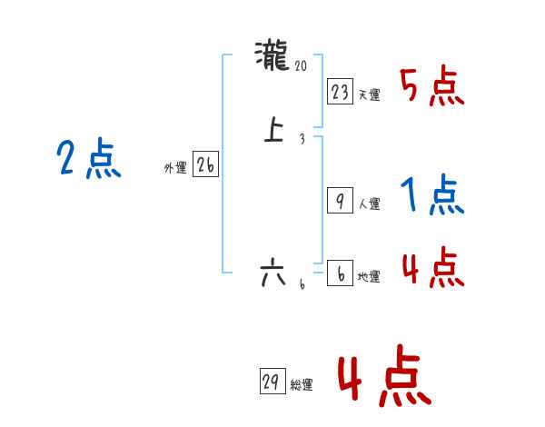 天運![]() | 瀧上六さんの天運は23画の5つ星!想像力に優れ活力がある。一代で成功し名誉を手に入れる。 家系が持つ宿命的な運勢を表します。祖先から受け継いだ苗字ですので自分の力が及びません。家柄を象徴します。 |
