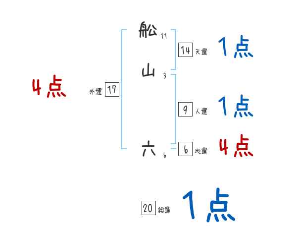 外運![]() | 舩山六さんの外運は17画の4つ星!積極的な行動力。地位を気づき財産を手に入れる。純粋な心と直感力。 生活面を象徴する運勢です。外部から受ける影響力を表し、結婚運、家庭運や職場、環境への順応性を表します。 |