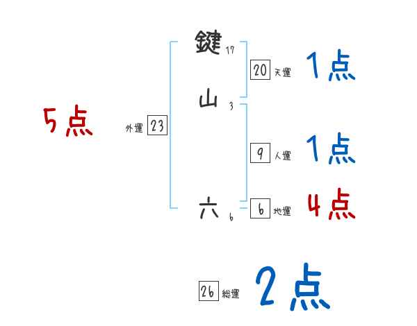 総運![]() | 鍵山六さんの総運は26画の2つ星!波瀾万丈かも。信頼できる人を大事にしましょう。 あなたの人生を表す1番重要な運勢です。生涯を通じて影響する総合運となり、主に50歳以降の晩年期に影響を及ぼします。 |