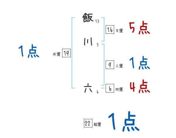 総運![]() | 飯川六さんの総運は22画の1つ星!努力することが苦手ないっぽう手先が器用。芸術性にも優れる。 あなたの人生を表す1番重要な運勢です。生涯を通じて影響する総合運となり、主に50歳以降の晩年期に影響を及ぼします。 |