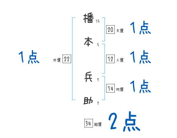 外運![]() | 播本兵助さんの外運は22画の1つ星!努力することが苦手ないっぽう手先が器用。芸術性にも優れる。 生活面を象徴する運勢です。外部から受ける影響力を表し、結婚運、家庭運や職場、環境への順応性を表します。 |