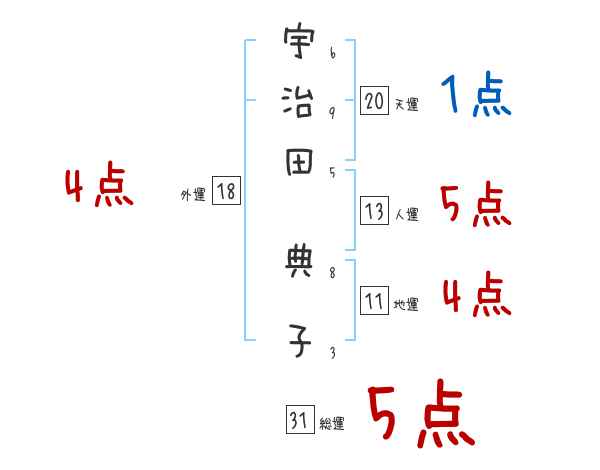 総運![]() | 宇治田典子さんの総運は31画の5つ星!社交性があり判断力に優れる。順風満帆な人生で円満な生活。 あなたの人生を表す1番重要な運勢です。生涯を通じて影響する総合運となり、主に50歳以降の晩年期に影響を及ぼします。 |