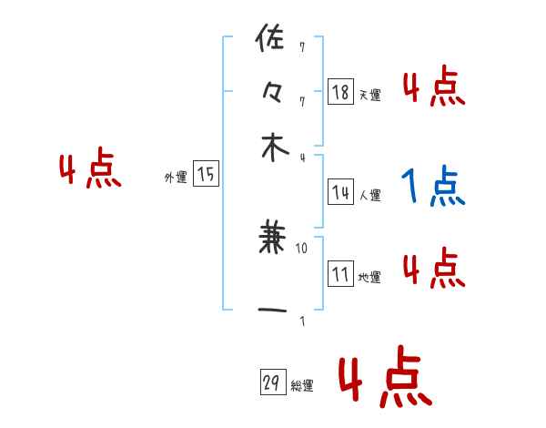 天運![]() | 佐々木兼一さんの天運は18画の4つ星!情熱的で剛気。忍耐力があり信頼される。 家系が持つ宿命的な運勢を表します。祖先から受け継いだ苗字ですので自分の力が及びません。家柄を象徴します。 |