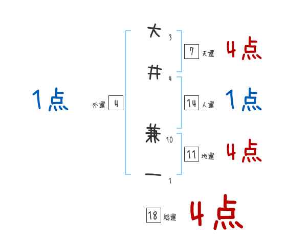 外運![]() | 大井兼一さんの外運は4画の1つ星!感情が不安定で苦労するかも。周囲との協調を心掛けましょう。 生活面を象徴する運勢です。外部から受ける影響力を表し、結婚運、家庭運や職場、環境への順応性を表します。 |