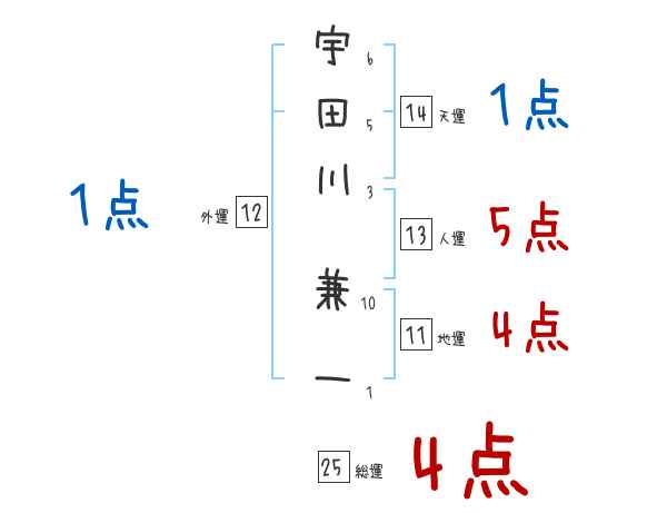 天運![]() | 宇田川兼一さんの天運は14画の1つ星!人に対して優しいがストレスを溜め込みがち。人間関係のトラブルを避けるよう気をつけましょう。 家系が持つ宿命的な運勢を表します。祖先から受け継いだ苗字ですので自分の力が及びません。家柄を象徴します。 |