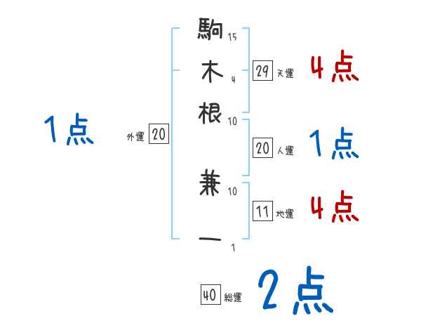 天運![]() | 駒木根兼一さんの天運は29画の4つ星!完全主義で才能がある。厳格な心の持ち主。 家系が持つ宿命的な運勢を表します。祖先から受け継いだ苗字ですので自分の力が及びません。家柄を象徴します。 |