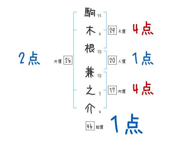 総運![]() | 駒木根兼之介さんの総運は46画の1つ星!迷走することが多く苦労するかも。目先のことにとらわれないように。 あなたの人生を表す1番重要な運勢です。生涯を通じて影響する総合運となり、主に50歳以降の晩年期に影響を及ぼします。 |