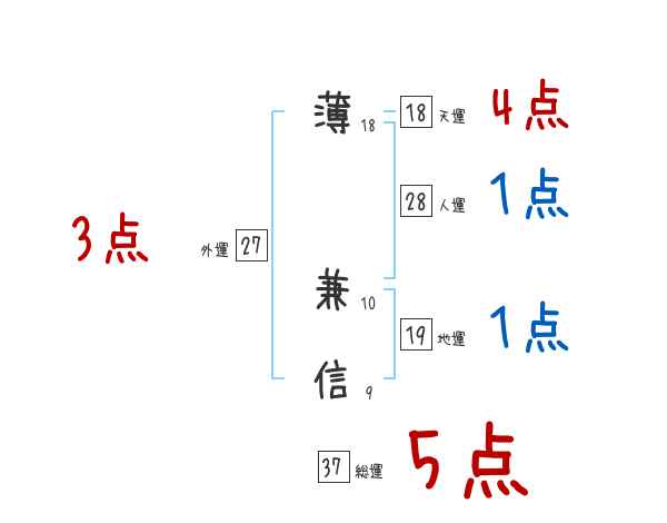 天運![]() | 薄兼信さんの天運は18画の4つ星!情熱的で剛気。忍耐力があり信頼される。 家系が持つ宿命的な運勢を表します。祖先から受け継いだ苗字ですので自分の力が及びません。家柄を象徴します。 |