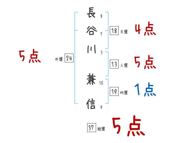 外運![]() | 長谷川兼信さんの外運は24画の5つ星!家庭運が良く順調な人生。金運にも恵まれる。 生活面を象徴する運勢です。外部から受ける影響力を表し、結婚運、家庭運や職場、環境への順応性を表します。 |