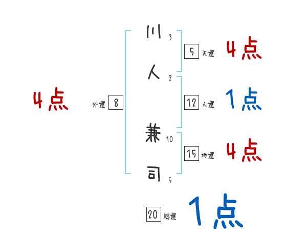天運![]() | 川人兼司さんの天運は5画の4つ星!健康で安泰。協調性に優れ、財産に恵まれる。 家系が持つ宿命的な運勢を表します。祖先から受け継いだ苗字ですので自分の力が及びません。家柄を象徴します。 |