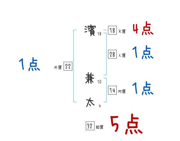 天運![]() | 濱兼太さんの天運は18画の4つ星!情熱的で剛気。忍耐力があり信頼される。 家系が持つ宿命的な運勢を表します。祖先から受け継いだ苗字ですので自分の力が及びません。家柄を象徴します。 |