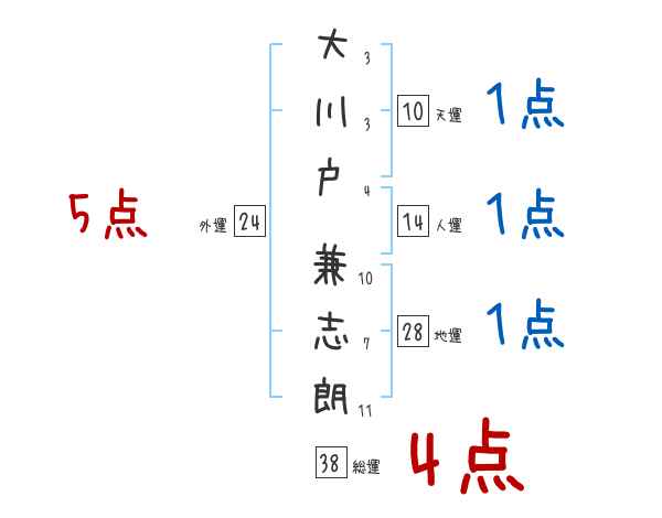 外運![]() | 大川戸兼志朗さんの外運は24画の5つ星!家庭運が良く順調な人生。金運にも恵まれる。 生活面を象徴する運勢です。外部から受ける影響力を表し、結婚運、家庭運や職場、環境への順応性を表します。 |
