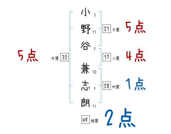 外運![]() | 小野谷兼志朗さんの外運は32画の5つ星!柔軟性があり成功する。チャンスが多く金運が良い。 生活面を象徴する運勢です。外部から受ける影響力を表し、結婚運、家庭運や職場、環境への順応性を表します。 |