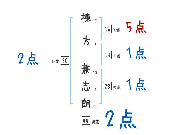 | 天運  | 棟方兼志朗さんの天運は16画の5つ星!人望が厚く大きく発展する。逆転成功が見える。家系が持つ宿命的な運勢を表します。祖先から受け継いだ苗字ですので自分の力が及びません。家柄を象徴します。 |