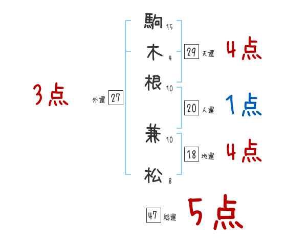 総運![]() | 駒木根兼松さんの総運は47画の5つ星!実力が開花し発展する円満な人生。財に恵まれる。 あなたの人生を表す1番重要な運勢です。生涯を通じて影響する総合運となり、主に50歳以降の晩年期に影響を及ぼします。 |