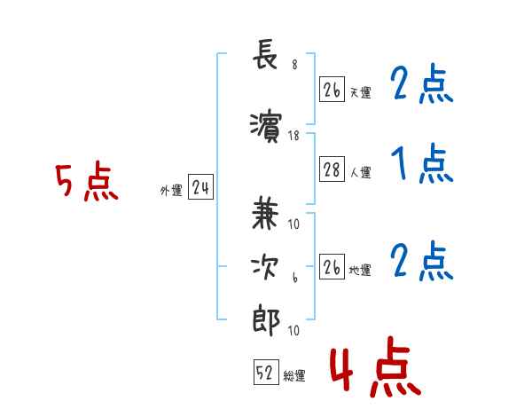 総運![]() | 長濵兼次郎さんの総運は52画の4つ星!先見性と独創性に優れ考える力がある。強運の持ち主。 あなたの人生を表す1番重要な運勢です。生涯を通じて影響する総合運となり、主に50歳以降の晩年期に影響を及ぼします。 |