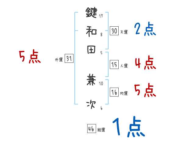 天運![]() | 鍵和田兼次さんの天運は30画の2つ星!浮き沈みの激しさに注意しましょう。 家系が持つ宿命的な運勢を表します。祖先から受け継いだ苗字ですので自分の力が及びません。家柄を象徴します。 |