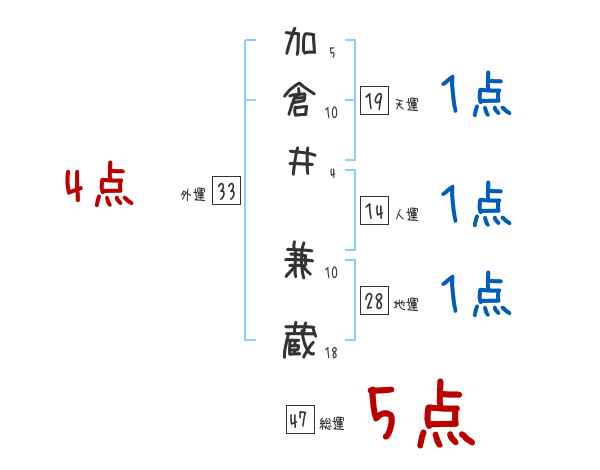 天運![]() | 加倉井兼蔵さんの天運は19画の1つ星!優れた才能を持ちますが、協調性が足りないことも。周りの人と協力する事を意識しましょう。 家系が持つ宿命的な運勢を表します。祖先から受け継いだ苗字ですので自分の力が及びません。家柄を象徴します。 |