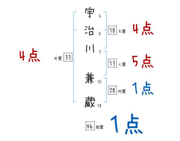 天運![]() | 宇治川兼蔵さんの天運は18画の4つ星!情熱的で剛気。忍耐力があり信頼される。 家系が持つ宿命的な運勢を表します。祖先から受け継いだ苗字ですので自分の力が及びません。家柄を象徴します。 |