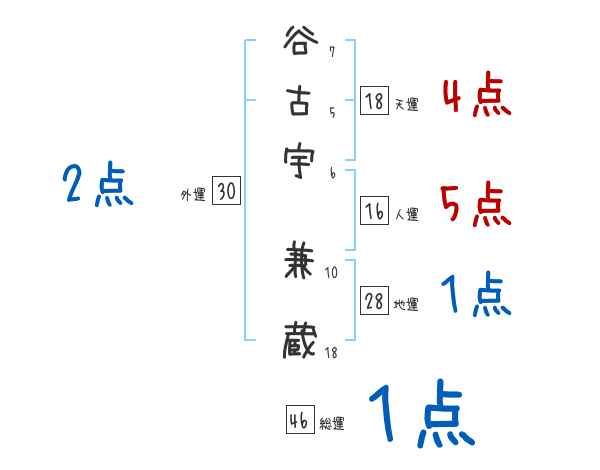 天運![]() | 谷古宇兼蔵さんの天運は18画の4つ星!情熱的で剛気。忍耐力があり信頼される。 家系が持つ宿命的な運勢を表します。祖先から受け継いだ苗字ですので自分の力が及びません。家柄を象徴します。 |