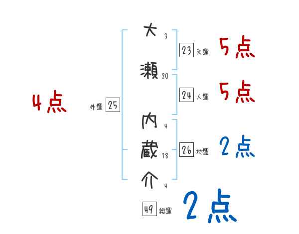天運![]() | 大瀬内蔵介さんの天運は23画の5つ星!想像力に優れ活力がある。一代で成功し名誉を手に入れる。 家系が持つ宿命的な運勢を表します。祖先から受け継いだ苗字ですので自分の力が及びません。家柄を象徴します。 |