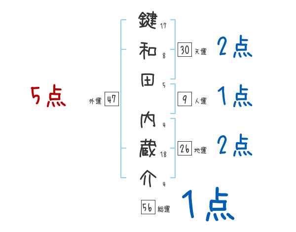 外運![]() | 鍵和田内蔵介さんの外運は47画の5つ星!実力が開花し発展する円満な人生。財に恵まれる。 生活面を象徴する運勢です。外部から受ける影響力を表し、結婚運、家庭運や職場、環境への順応性を表します。 |